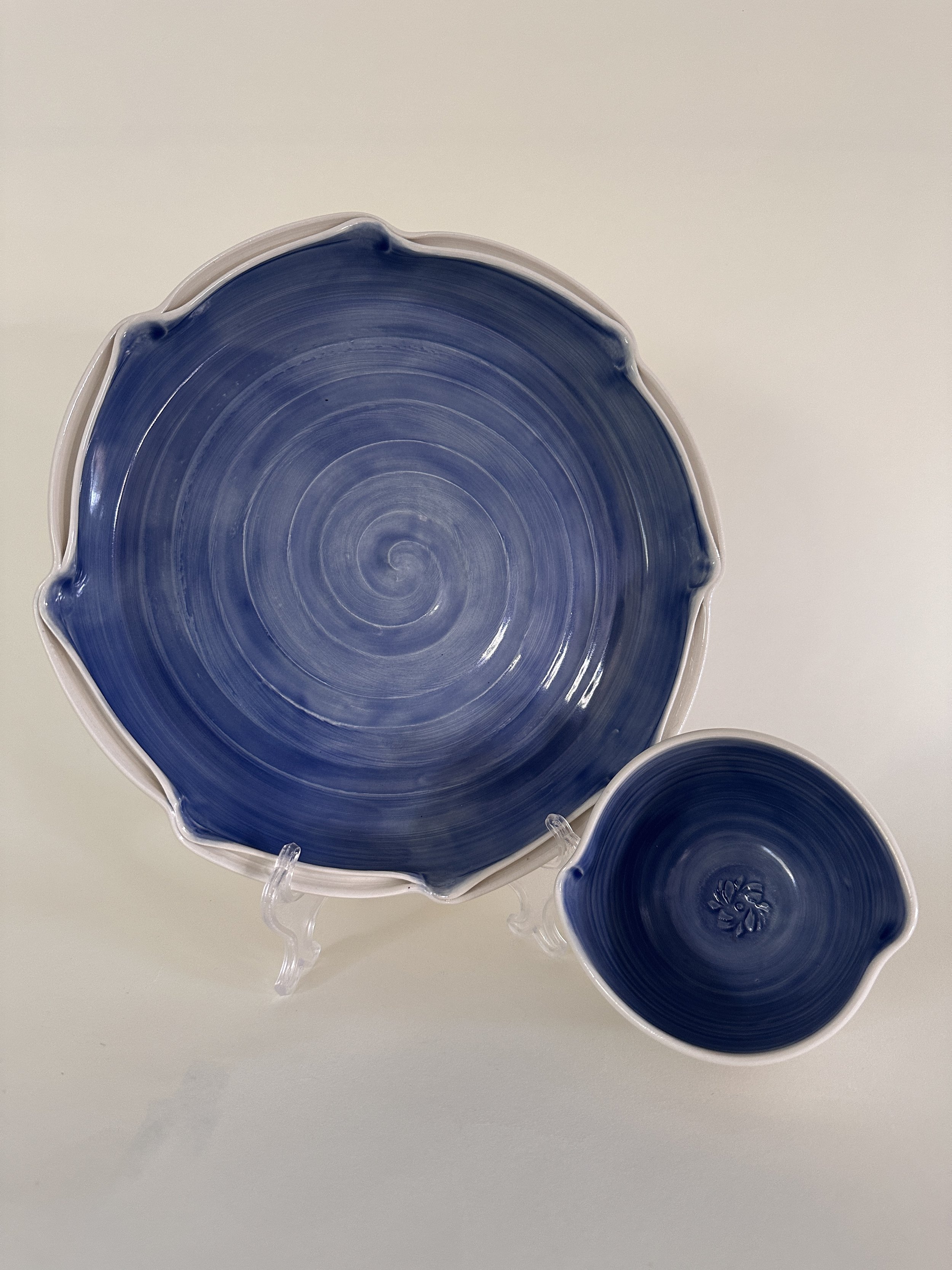 Wheel thrown and scallop jewelry plate with stamped embellishment in the center - clear glossy glaze on porcelain clay.