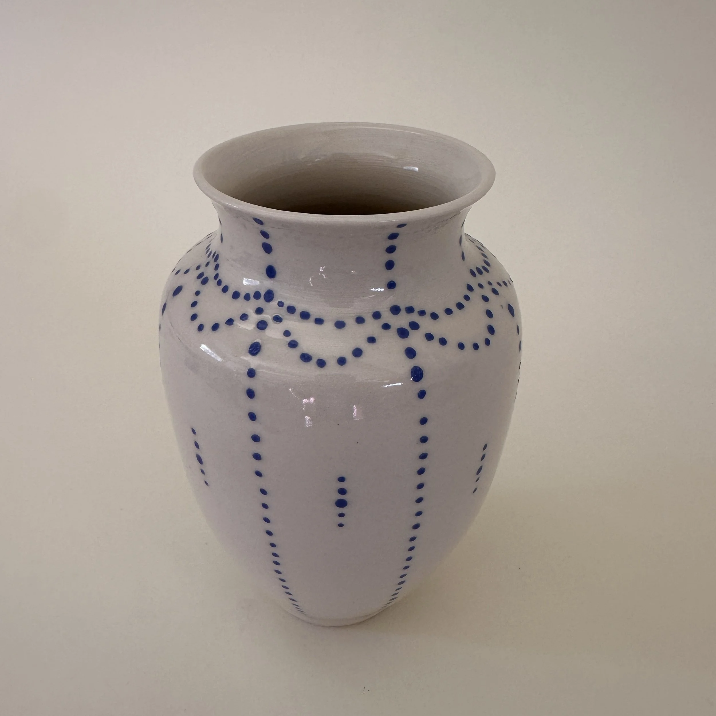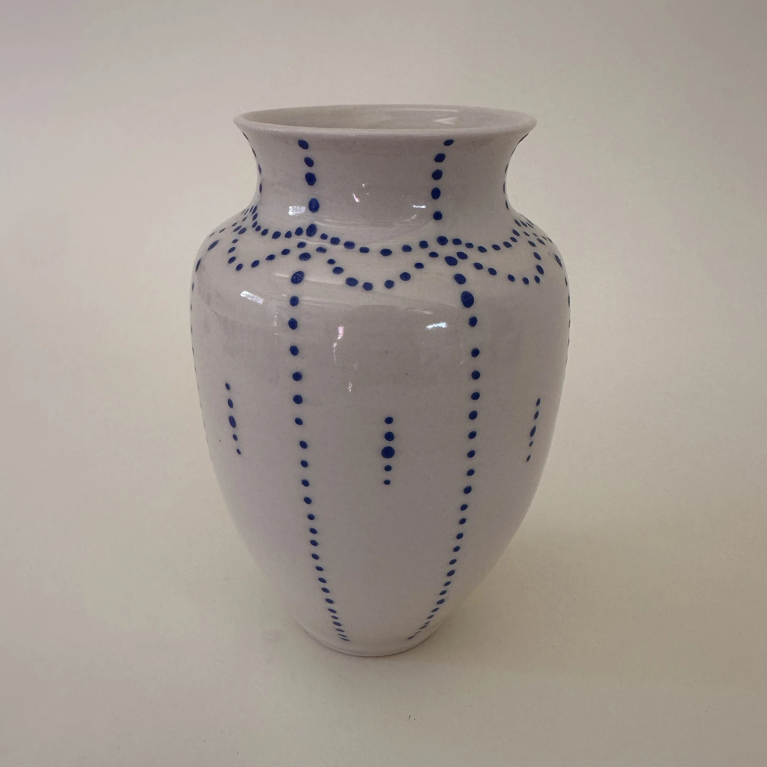 Azure and white slip decoration with clear glossy glaze on porcelain clay. Each item is designed, handmade, glazed, or decorated in small batches.